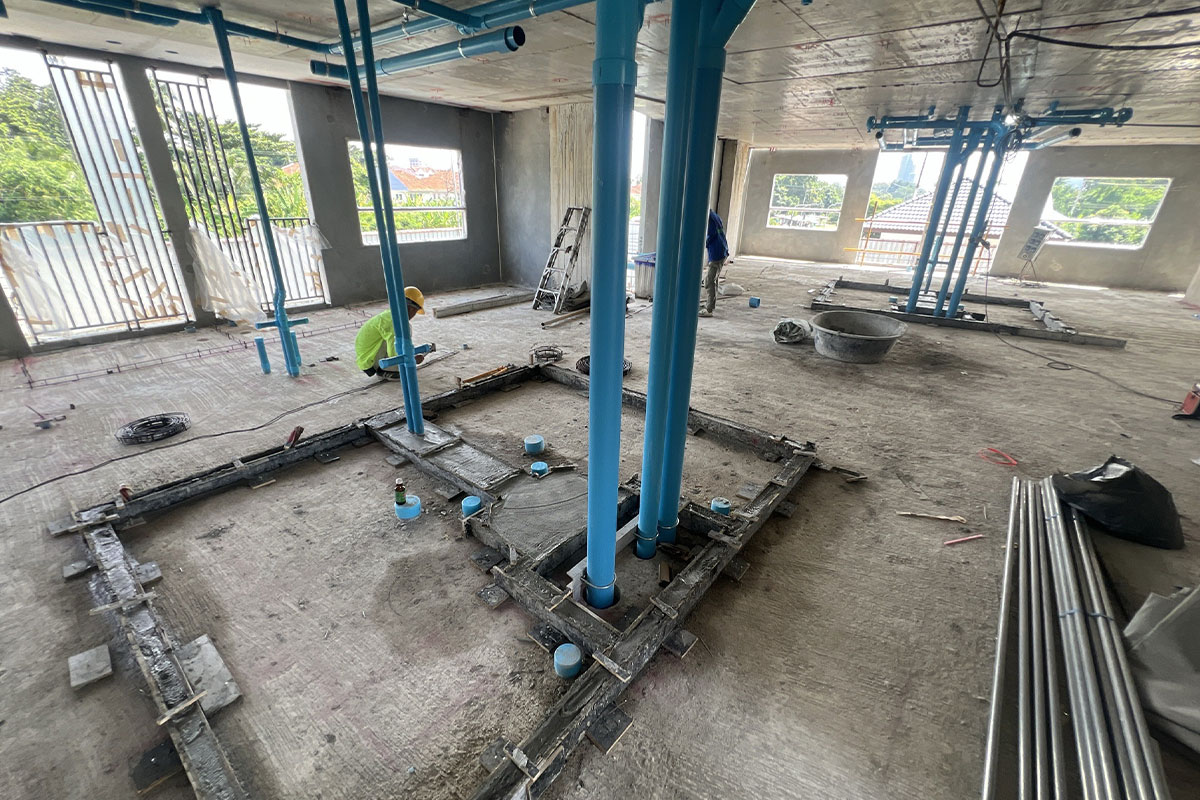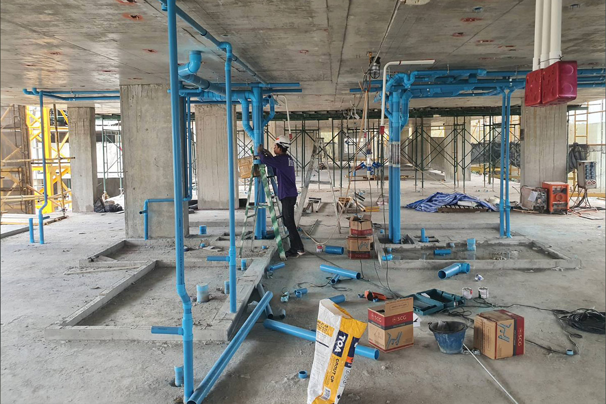 A栋电气系统完成至6楼, 管道系统成至7楼,空调系统完成至3层